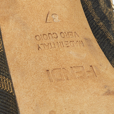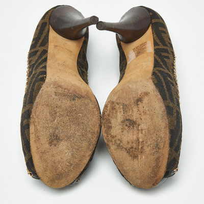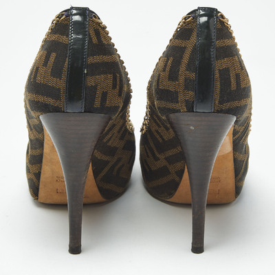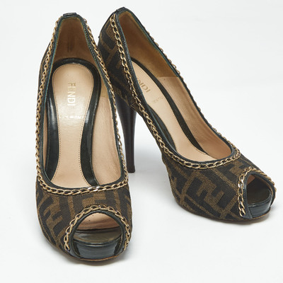 Make a style statement in true Fendi style with these gorgeous platform pumps The womens pumps are crafted from Tobacco Zucca canvas and feature peep toes, chain embellishments, platforms, and 12.5cm heels.
