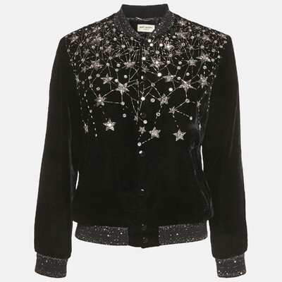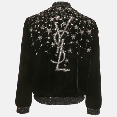 Rich black velvet with delicate embellishments gives this Saint Laurent womens bomber jacket a luxurious edge. It’s the kind of jacket you pull on over a simple tee and jeans and suddenly feel completely polished, or layer over evening wear for a subtle statement.