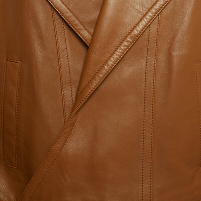 This Saint Laurent Paris jacket in brown leather features a wrap style front with a buckle fastening at the waist. The cut is relaxed, creating a luxurious profile, while soft leather and precise stitching highlight the brand’s attention to detail.