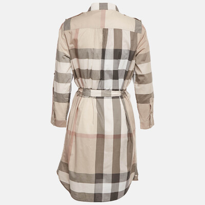 A reimagining of Burberry’s house codes, this cotton shirt dress features the brand’s signature check print in beige tones. Its structured collar, button front, and mini length lend a modern twist to a classic British icon.