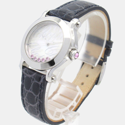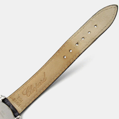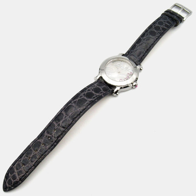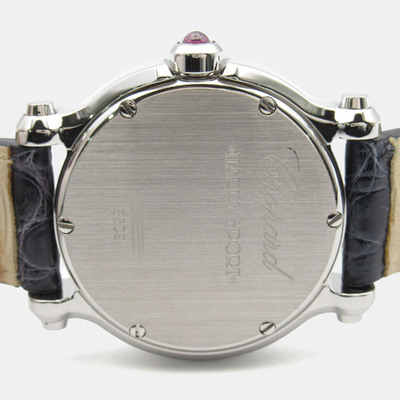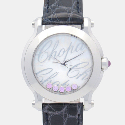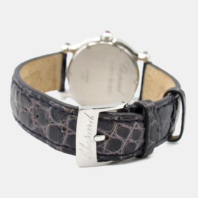 This authentic pre owned Chopard Happy Sport 8509 is a charming designer quartz wristwatch that captures the joyful spirit of the iconic Happy Sport collection. Crafted in white stainless steel, this 30 mm women’s timepiece embodies elegance and playful sophistication. A pre loved Chopard watch that seamlessly blends luxury and whimsy, making it a timeless addition to any refined collection.