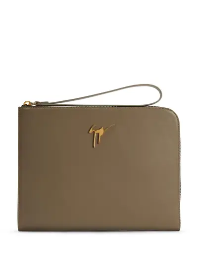 taupe leather smooth grain gold-tone logo plaque and hardware wrist strap top zip fastening main compartment multiple internal slip pockets