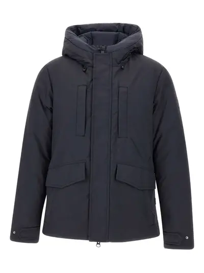 navy blue quilted hood concealed zip closure front flap pockets zipped chest pockets