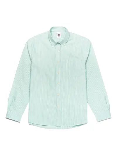green and white vertical stripe pattern classic collar chest pocket buttoned cuffs