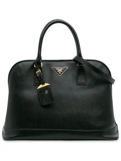 saffiano lux leather body rolled leather handles detachable flat leather strap open top with magnetic snap closure interior zip and slip pockets black Inclusions: name tag, shoulder strap. Condition: GOOD. This previously owned and used item is in good condition with minimal signs of use. This may include fading of material or plating and scratches. Please refer to the photos on this product page for a detailed view of the item, including any damages declared.