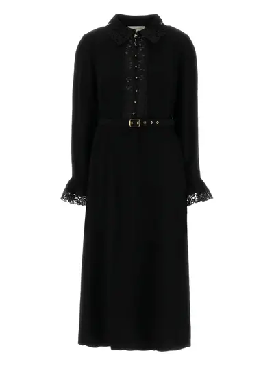 black lace detail belted waist front button fastening long sleeves classic collar