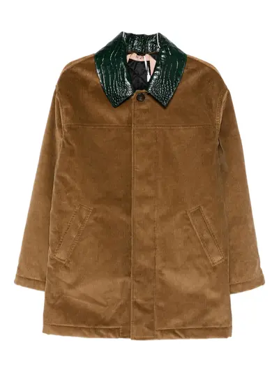 brown crocodile effect collar concealed front fastening front welt pockets corduroy texture straight hem