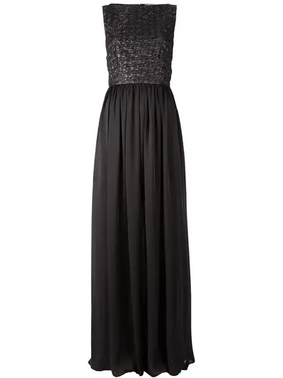 Black silk blend puckering sleeveless gown from Maison Rabih Kayrouz featuring a slash neck, a sleeveless design, a back zip fastening and a full length pleated skirt.