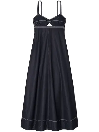 indigo blue cotton contrast stitching concealed rear zip fastening sweetheart neck sleeveless mid-length