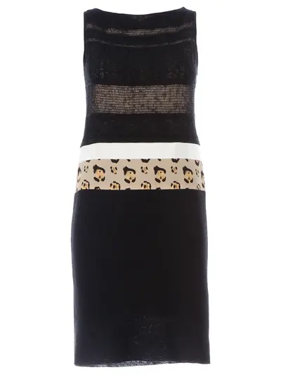 Black linen blend sleeveless dress from Giambattista Valli featuring a slash neck, a fine knit patterned bodice, a white waist paenl, a leopard print waist panel and a knitted skirt section.