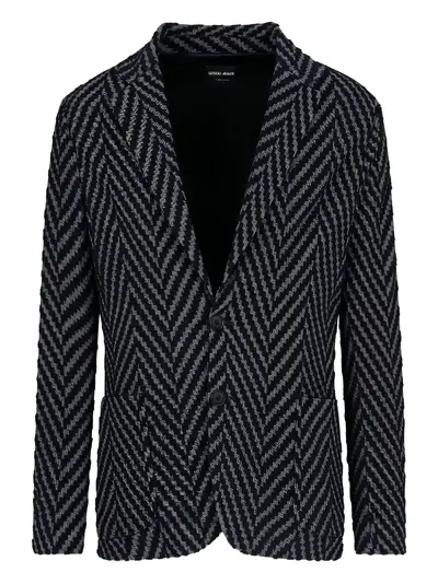 dark blue and grey chevron jacquard pattern button fastening front patch pockets long sleeve
