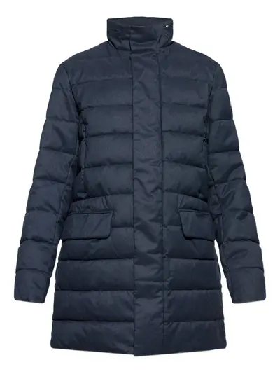 dark blue padded design high neck front pockets button fastening long sleeves
