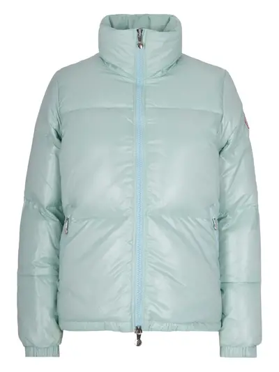 green puffer design zip fastening high neck logo patch elasticated cuffs