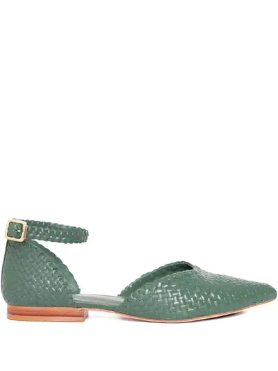 olive green woven design ankle strap buckle fastening pointed toe flat sole