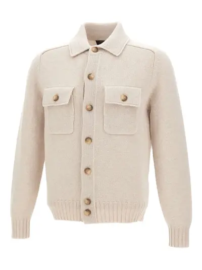hazelnut beige wool knit classic collar front button closure patch pockets ribbed edges