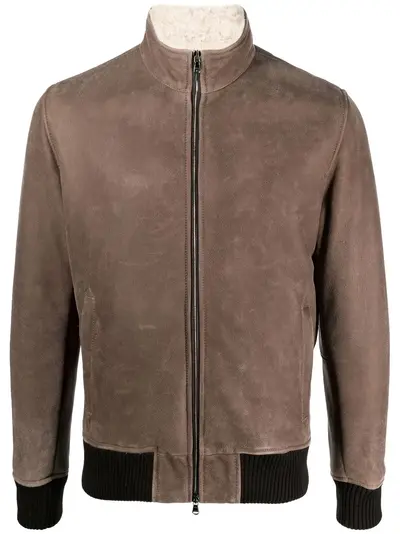 brown calf leather high neck front zip fastening shearling lining long sleeves ribbed detailing two side slit pockets