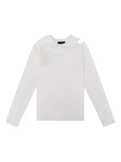 white cotton blend diagonal seam long sleeves crew neck shoulder cut-out