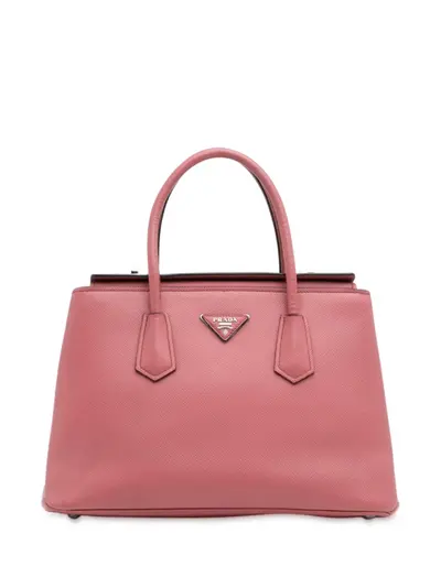 saffiano leather body rolled leather handles fold over top flap with turn lock closures interior center zip compartment interior zip and slip pockets pink This item has no inclusions. Condition: GOOD. This previously owned and used item is in good condition with minimal signs of use. This may include fading of material or plating and scratches. Declared Damages: Exterior Top Feature(s) Moderate Cracks. Interior Pocket Feature(s) Moderate Stains. Please refer to the photos on this product page for a detailed view of the item, including any damages declared.