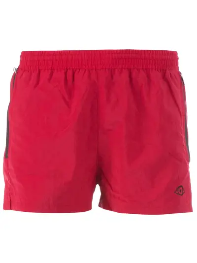 Red 'Jikai' swim shorts from L'éclaireur featuring an elasticated waistband, side zipped pockets and a logo at the hem.