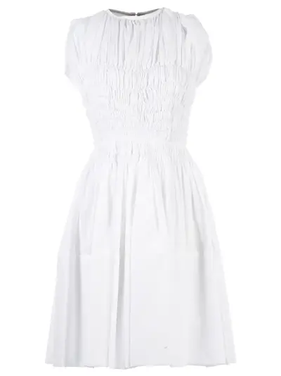 White cotton dress from Maison Rabih Kayrouz featuring a round neck, a ruched design, a fitted waist, a flared skirt, pleated details and a rear hook and eye fastening.