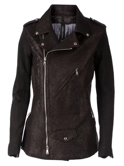 Black leather distressed mesh biker jacket from Giorgio Brato.