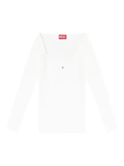 white ribbed texture wide round neckline long sleeves overlock seams logo detail