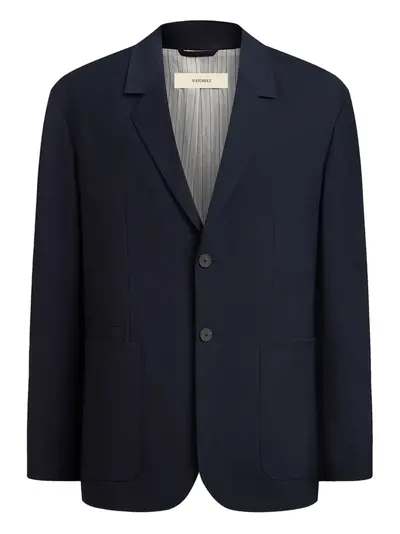 dark blue wool blend button fastening front patch pockets buttoned cuffs notched lapels