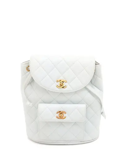 lambskin leather body adjustable leather woven chain link back straps top flap with CC turnlock and drawstring closure exterior front flap pocket white Serial Number: 3266001 Inclusions: dust bag, authenticity card, box. Condition: GOOD. This previously owned and used item is in good condition with minimal signs of use. This may include fading of material or plating and scratches. Due to the exclusivity of this item and its limited availability, processing and delivery might take longer than usual. Declared Damages: Exterior Side Feature(s) Moderate Creases. Exterior Back Feature(s) Moderate Creases. Please refer to the photos on this product page for a detailed view of the item, including any damages declared.