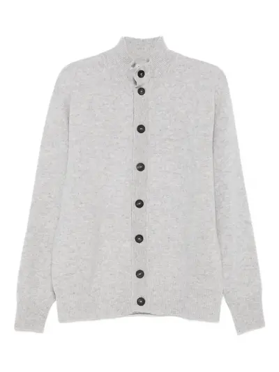 light grey button fastening high neck ribbed hem ribbed cuffs long sleeves