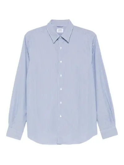 blue stripe pattern front button closure long sleeves buttoned cuffs classic collar