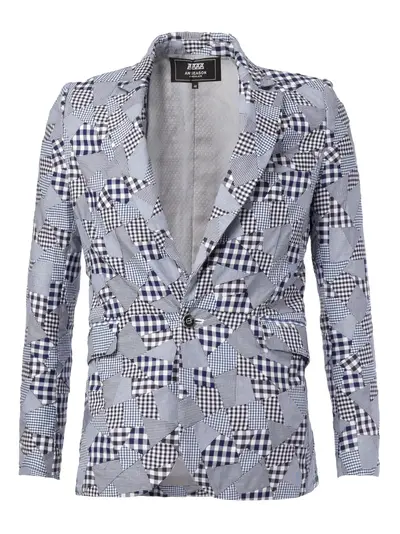 Blue and white cotton Gingham patch blazer from Anrealage. This is a printed blazer, a patchwork compound and it is handmade.
