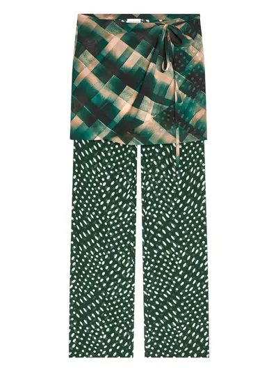bottle green abstract check print wrap-around skirt spotted trousers knot detail