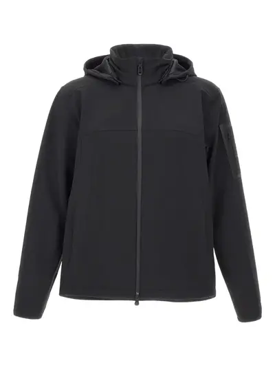 black removable drawstring hood two-way zip fastening side zip pockets sleeve pocket rubber logo detail