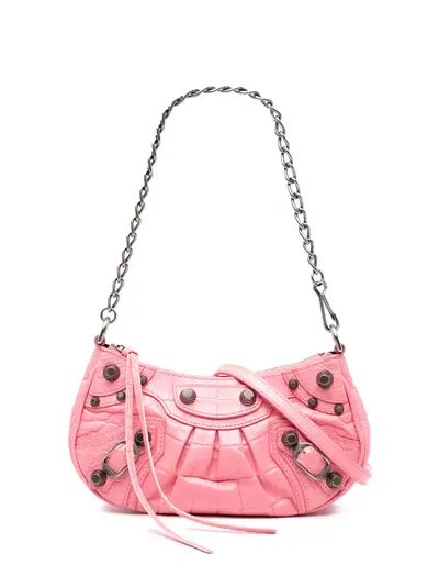 embossed leather body chain link handle flat adjustable and detachable leather shoulder strap top zip closure interior slip pockets pink Serial Number: 695814 Inclusions: shoulder strap. Condition: EXCELLENT. This previously owned item is in near-perfect condition with no signs of damage or use. Please refer to the photos on this product page for a detailed view of the item, including any damages declared.