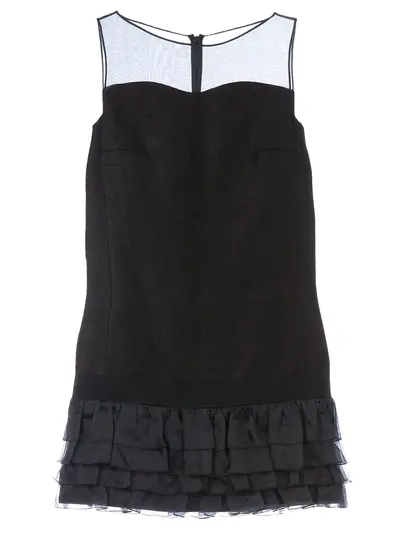 Black linen dress from Giambattista Valli featuring a round neckline, a sheer panel at the chest and back of the shoulders, a dropped waist with layered silk ruffles and a back zip fastening.