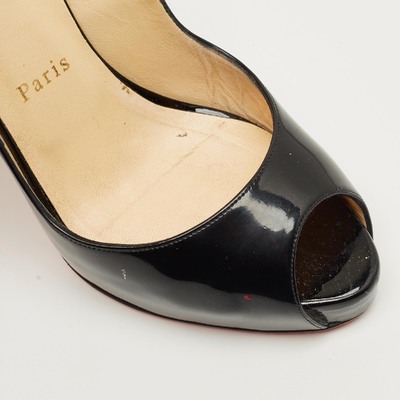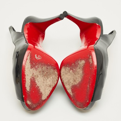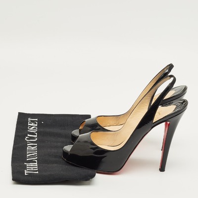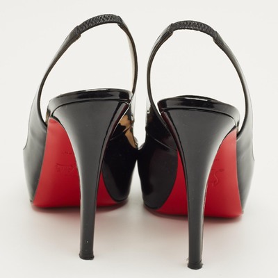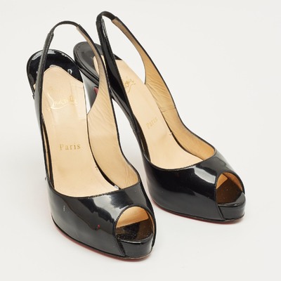 Step into sophistication with these Christian Louboutin Private Number slingback pumps in glossy black patent leather. Featuring a sculpted peep toe and slender heel, they add instant allure to any look. Finished with the iconic red sole for unmistakable luxury.