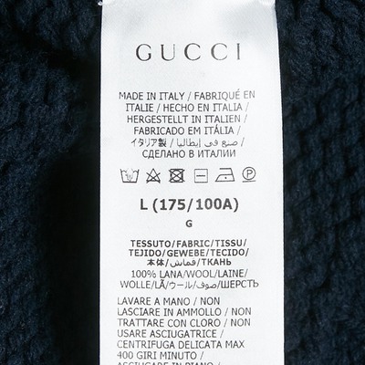 Gucci’s navy blue cardigan is knitted in a cable pattern with logo intarsia detailing. The button down front and ribbed trims create a classic silhouette with a contemporary edge. A stylish layer that enhances everyday dressing.