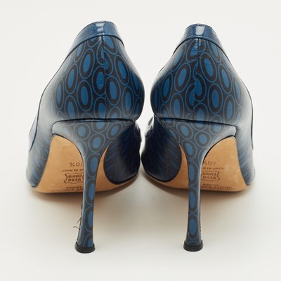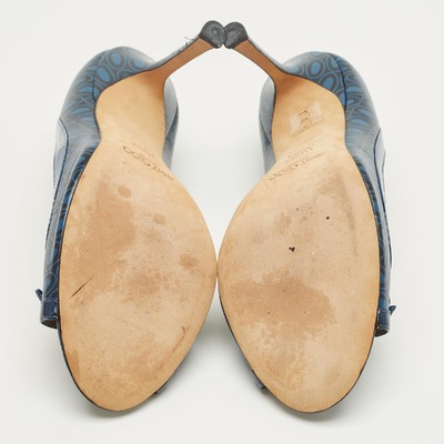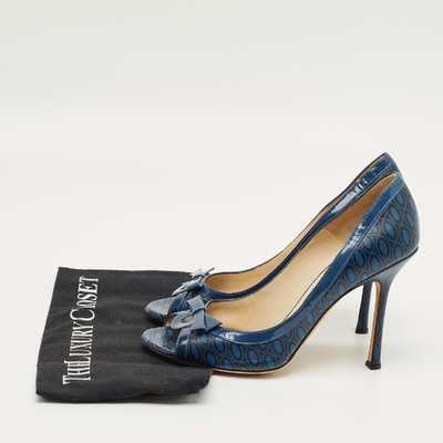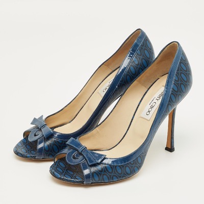 Make a striking entrance with these Jimmy Choo peep toe pumps in glossy blue printed leather and patent finish. The bow detailing on the vamps adds an artistic flair, while the 10cm heels elongates the foot. A standout choice for special occasions.