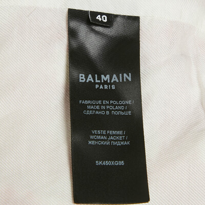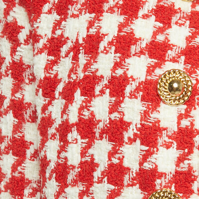 This Balmain jacket is tailored in red and white tweed featuring the house’s houndstooth pattern. The open front design and strong shoulders define its polished shape, while the textured weave adds dimension. A statement piece that embodies Balmain’s bold approach to tailored outerwear.
