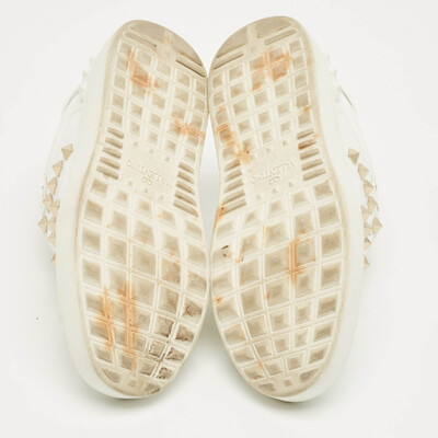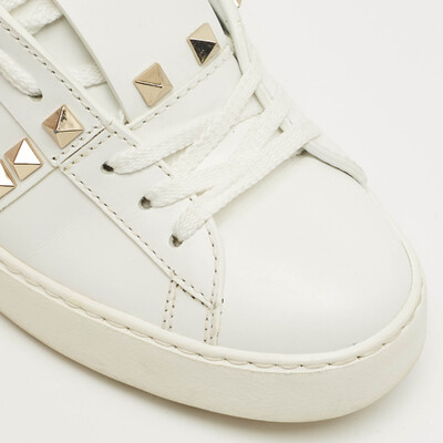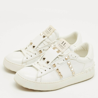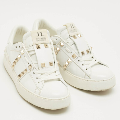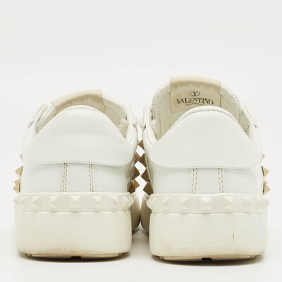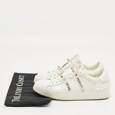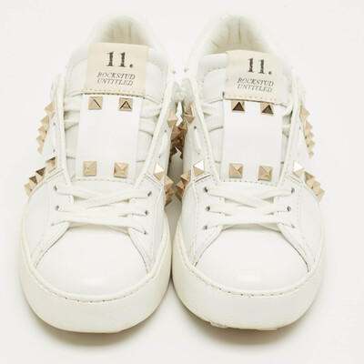 Minimalist yet iconic, these Valentino Rockstud Untitled sneakers in white leather feature signature platinum studs across the heel. Clean lines meet edgy luxury for everyday style. A perfect blend of comfort and couture.