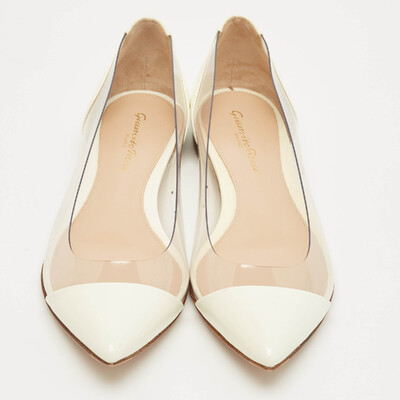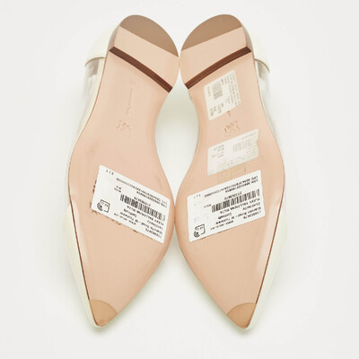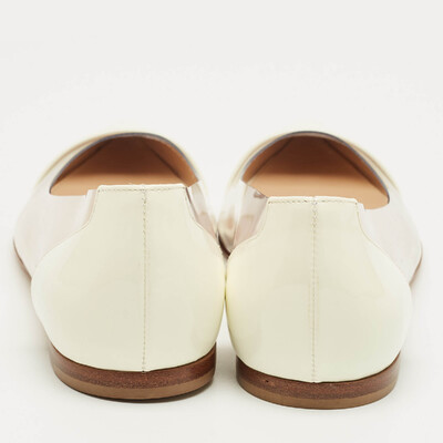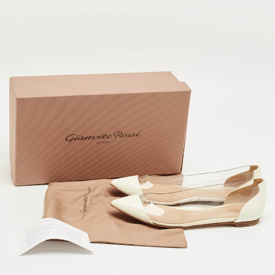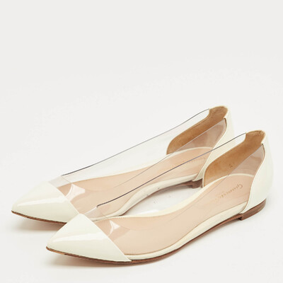 Gianvito Rossi’s ballet flats pair white patent leather with clear PVC panels. The plexi gives a modern twist to a classic shape, while the low profile makes them easy to wear with skirts, trousers, or dresses.