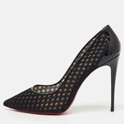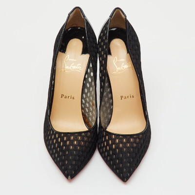 Sleek and sophisticated, these Christian Louboutin pumps combine smooth fabric with lustrous patent leather for a refined contrast. The sharp pointed toe elongates the leg for a powerful silhouette. A timeless heel for both professional and evening wear.