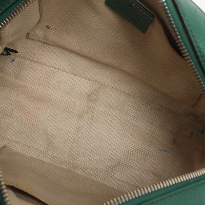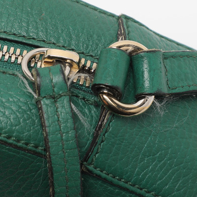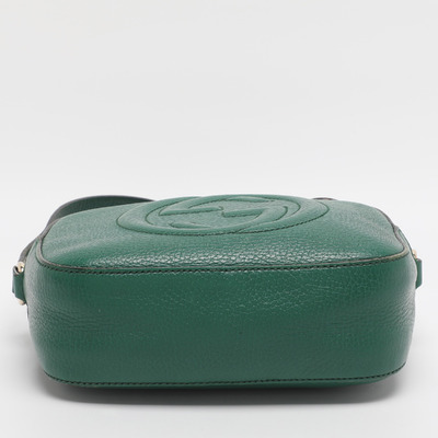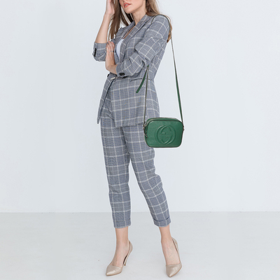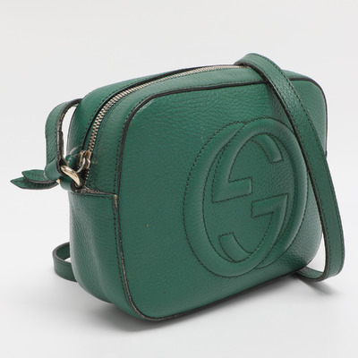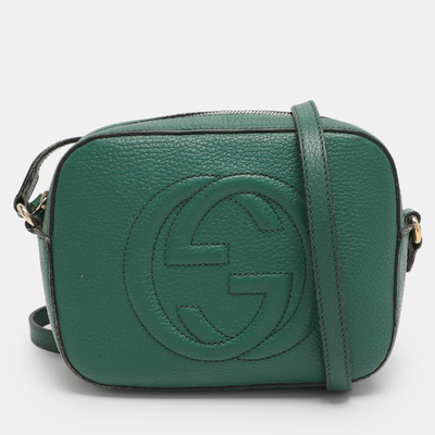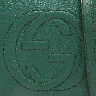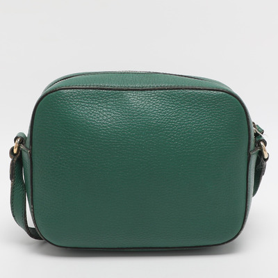 Guccis expertise in creating noteworthy designs is evident in this Soho bag. Made from green leather, it gets a luxe update with a brand motif on the front and displays a shoulder strap. The zipper closure at the top secures the canvas lined interior of the bag.