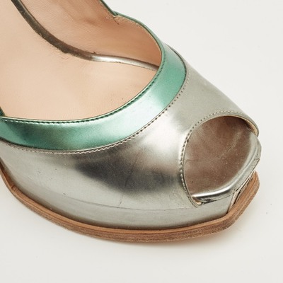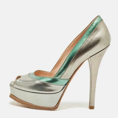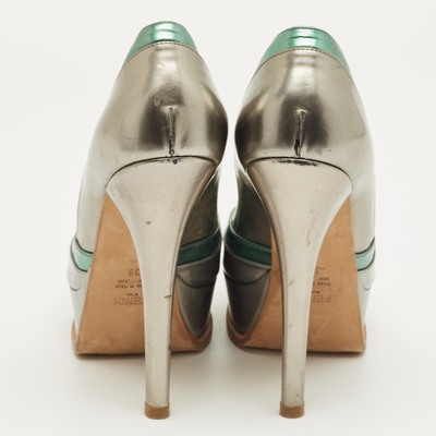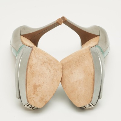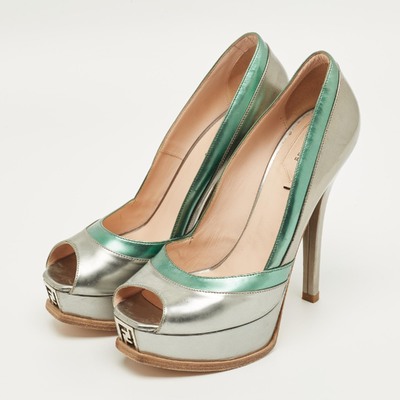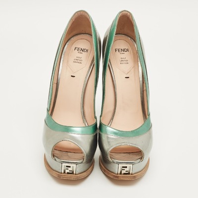 A flash of metallic silver meets mint green in Fendi’s Fendista pumps, where color and form collide with bold intent. The peep toe and platform sole showcase the signature “FF” logo, while the high heel lifts every step with energy.