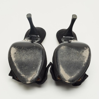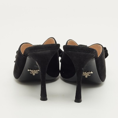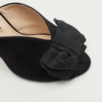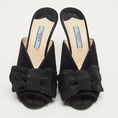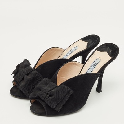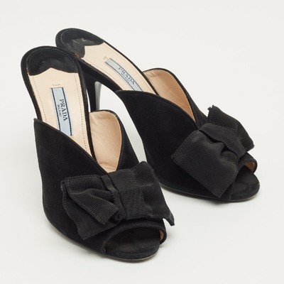 Designed purposely for fashion queens like you, these Prada mules are simply gorgeous They come flaunting 11 cm heels and peep toes, with exteriors wonderfully crafted from velvet and detailed with grosgrain bows. To look your best, you can wear the pair with high waist pants and a satin top.