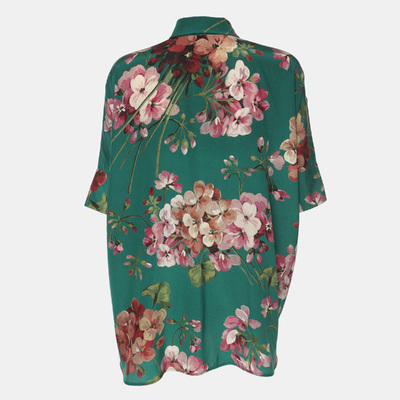 Rendered in pure silk, this Gucci shirt features a green floral print enriched with a neck tie detail for versatile styling. The long sleeves and buttoned cuffs lend definition, while the fluid silhouette adds sophistication. It’s a statement piece that seamlessly blends vintage charm with modern femininity.