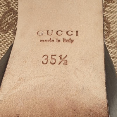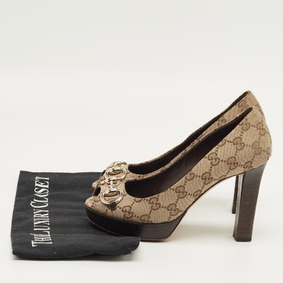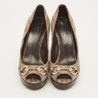 Infused with heritage charm, these Gucci platform pumps feature the iconic GG canvas with leather trim and signature Horsebit detail on the vamps. The elevated heel adds modern flair to a timeless classic. A chic fusion of retro and contemporary.
