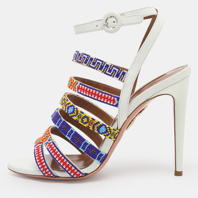 Aquazzura’s ankle strap sandals are intricately designed with white beaded detailing across slim leather straps. The open toe silhouette sits atop a slender heel, offering a delicate balance of charm and finesse. Perfect for summer soirées or resort wear, these sandals add a note of radiance to any ensemble.