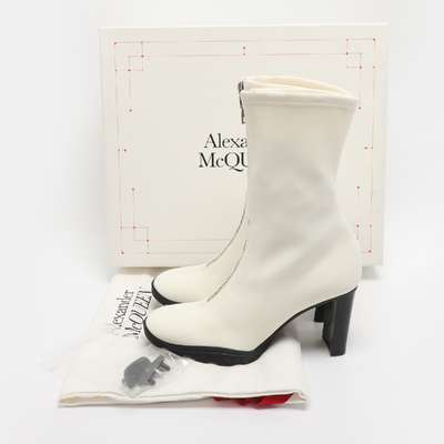 These Alexander McQueen boots are made from white neoprene and set on the brand’s signature tread sole. The mid calf height and pull on design offer both style and practicality. Merging street inspired design with couture precision, they make a bold addition to contemporary wardrobes.