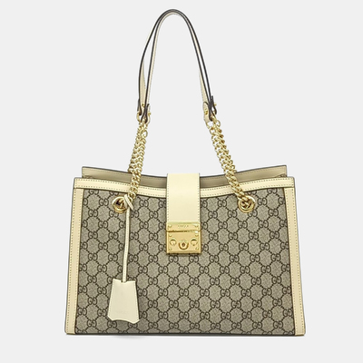 The authentic Gucci Beige White PVC Supreme Padlock Shoulder Bag is a stylish and contemporary accessory that combines iconic design with everyday functionality. This designer pre owned Gucci bag features the signature Supreme canvas in beige and white, accented with a distinctive padlock detail for a modern, sophisticated touch. Perfect for carrying essentials, it blends luxury with practicality. A pre loved Gucci Supreme Padlock Shoulder Bag, it reflects timeless craftsmanship and enduring fashion appeal.